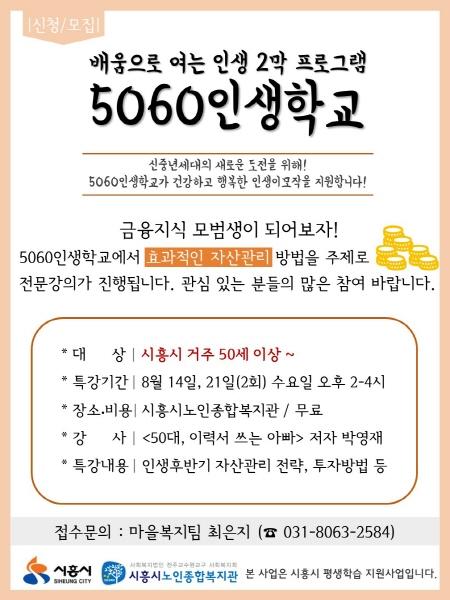 ‘5060인생학교’는 시흥시 평생학습과의 신중년 평생학습 지원사업으로 은퇴를 시작하는 5060세대들의 건강하고 행복한 제2의 인생을 지원하기위해 기획되었으며, 현재 정리수납전문가 2급 양성과정과 생활목공교실 등 경력개발 프로그램이 진행되고 있다.