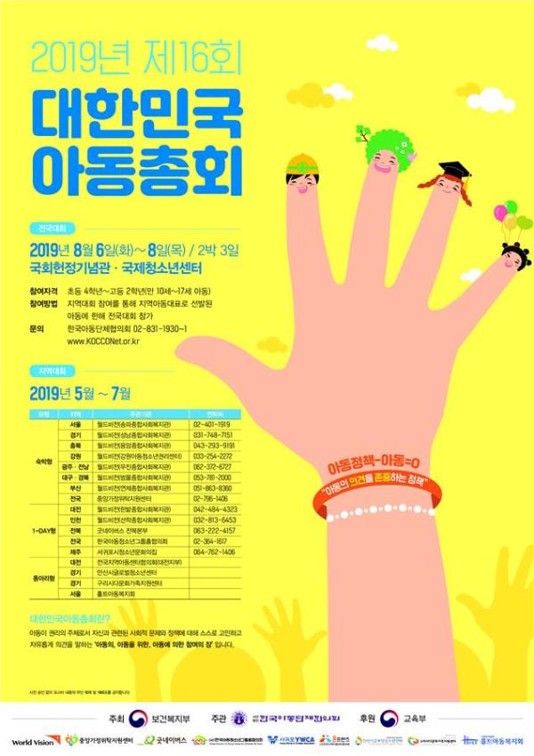보건복지부가 주최하고, 사단법인 한국아동단체협의회가 주관하는 ‘대한민국 아동총회’가 6일부터 오는 8일까지 2박3일 동안 국회 및 국제청소년센터에서 열린다고 밝혔다.