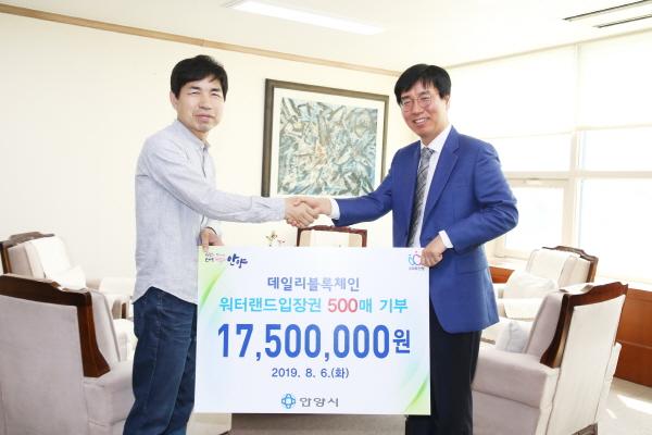 안양시는 지역의 스마트시티 선도기업인 데일리블록체인을 운영하는 김남진 대표가 한 매당 3만5천 원 하는 워터테마파크입장권 5백매를 6일 시에 기증했다고 밝혔다.