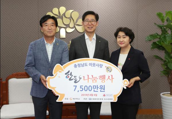 이날 기탁한 돼지고기는 13톤으로, 충남한돈협회 회원 농가들이 돼지를 키우며 조성한 한돈자조금으로 마련했다.