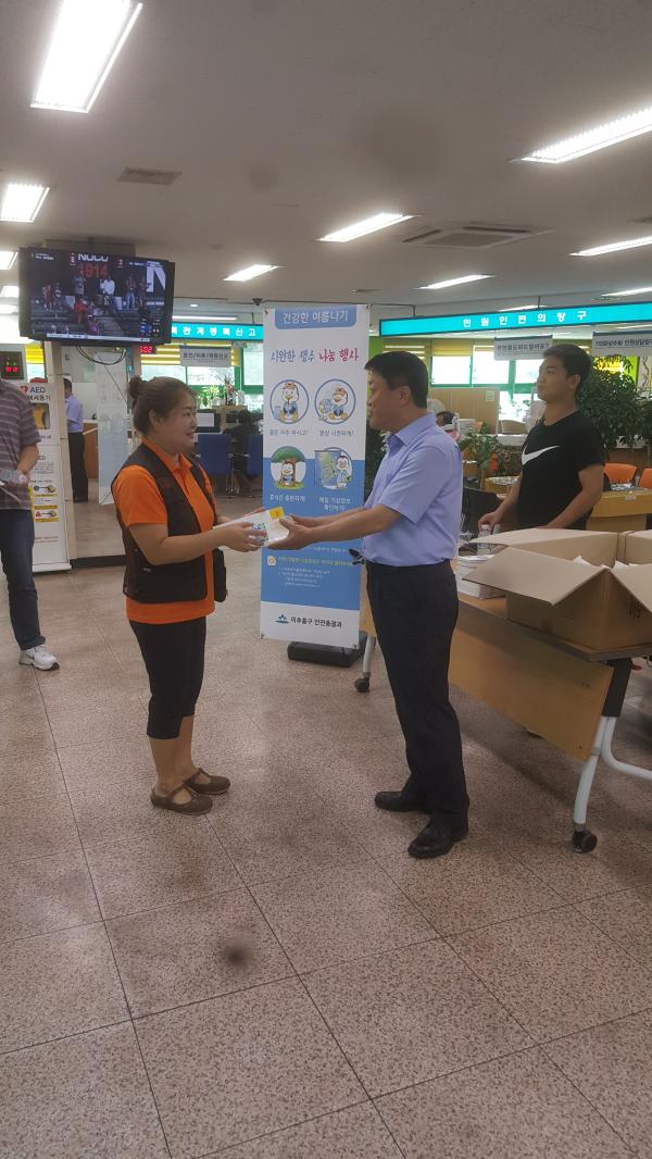 구는 폭염이 가장 심화되는 6일부터 8일까지 3일간 구청 방문 민원인을 대상으로 시원하게 얼린 생수, 물티슈 및 폭염대비 행동요령 소책자를 제공한다.