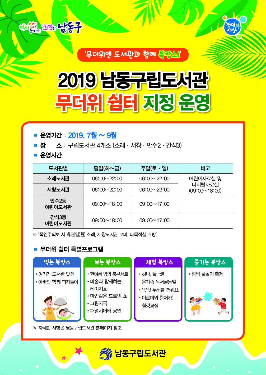 다양한 문화 프로그램 편성도 눈길을 끈다. 남동구립도서관은 10개 총 16회의 다양한 문화 프로그램을 4개의 테마 별로 편성해 구민들에게 폭넓은 문화체험이 이뤄질 수 있도록 기획했다. 또 소래도서관과 서창도서관에서 임시 물놀이장을 조성해 구민들이 무더위를 식힐 수 있도록 운영할 예정이다.