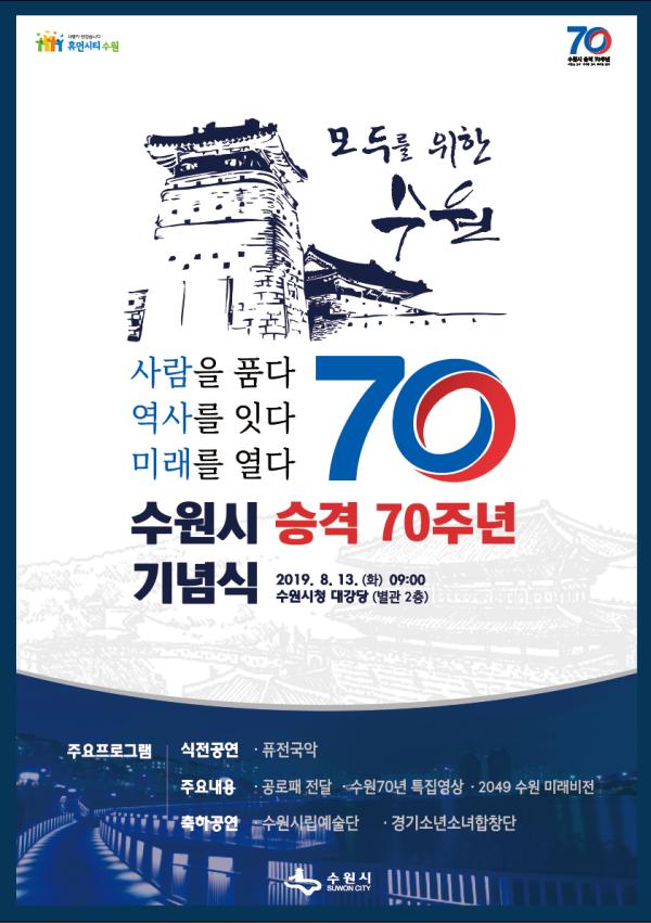염태영 수원시장은 역대 수원시장과 ‘수원시 100년 가게’로 선정된 2개 업체 대표에게 공로패를 수여한다. 1949년 8월 15일 수원읍에서 수원시로 승격된 후 70년 동안 인구 125만 명 대도시로 성장하는 과정을 소개하는 영상도 상영한다.