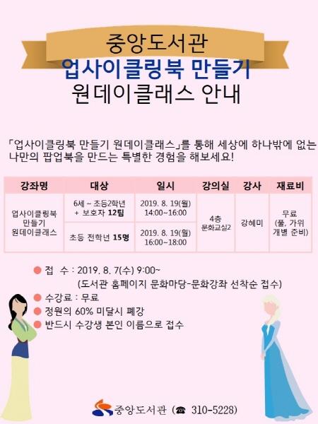 오후 2시부터 두 시간은 6세~초등2학년 아동과 보호자가 함께 팝업북을 만들며 추억을 쌓을 수 있도록, 오후 4시부터 두 시간은 보호자 없이 초등 전학년이 참여해 자기만의 개성있는 팝업북을 만들고 서로의 작품을 감상할 수 있도록 강좌가 준비됐다.