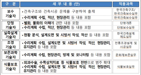 이에 문화재청은 ‘문화재수리 등에 관한 법률 시행령’을 개정하여 문화재수리기술자 자격시험 공통 과목인 한국사를 한국사능력검정시험으로 대체하고, 논술형 과목 일부에 ‘실무’를 추가하여 명칭을 변경하였으며, 오는 2020년 자격시험부터 적용한다.