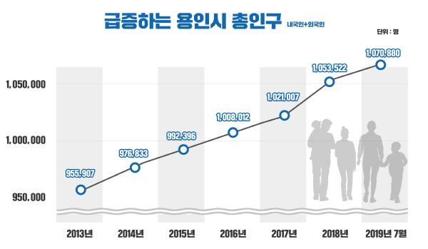 지난 7월말 용인시 인구는 내국인만도 105만 명을 넘어섰고 외국인을 포함한 총인구는 107만 명을 돌파한 것으로 나타났다.