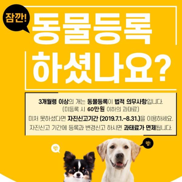 시 축산과 장상엽 과장은 “9월부터 반려견 등록과 관련한 단속을 실시하여 과태료를 부과할 예정이니 반려견을 등록하지 않거나 변경신고하지 않은 경우 자진신고기간에 등록하시길 바라며, 반려견 동반 외출 시 목줄을 반드시 착용하고 배설물을 수거 하는 등 성숙한 반려동물 문화 조성에 앞장서는 이천시민이 되어 주시길 부탁한다.”고 말했다.