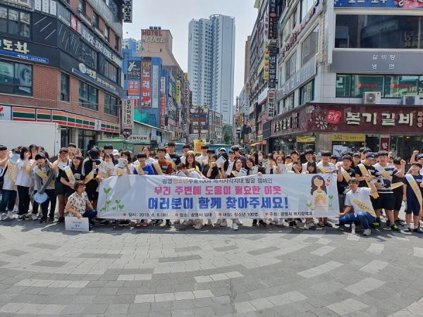광명시는 지난 6일 여름방학을 맞은 청소년 100여명과 함께 철산역과 광명사거리역 주변에서 복지사각지대 발굴 활성화를 위한 거리 캠페인을 실시했다.