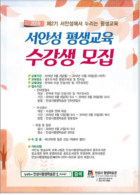 안성시 평생학습관에서 ‘2019년 제2기 서안성 평생학습’ 수강생 125명을 모집한다.