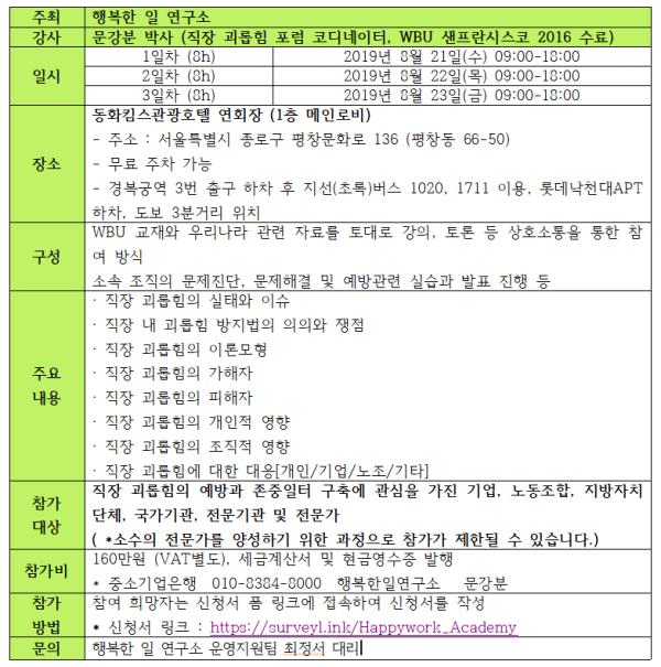 7월 16일 시행된 직장 내 괴롭힘 금지법 시행 후 개최되는 본 아카데미가 괴롭힘 해결책을 찾는 인사노무 종사자들에게 좋은 기회가 될 것으로 보인다. 아카데미는 평창동에 위치한 동화킴스관광호텔에서 진행되며, WBU 교재와 우리나라 관련 자료를 토대로 강의와 토론을 통한 참여형식의 수업으로 구성했다. 이번 아카데미는 소수 정예과정으로 최상의 교육과 네트워킹을 병행할 수 있도록 진행하겠다는 계획이다.
