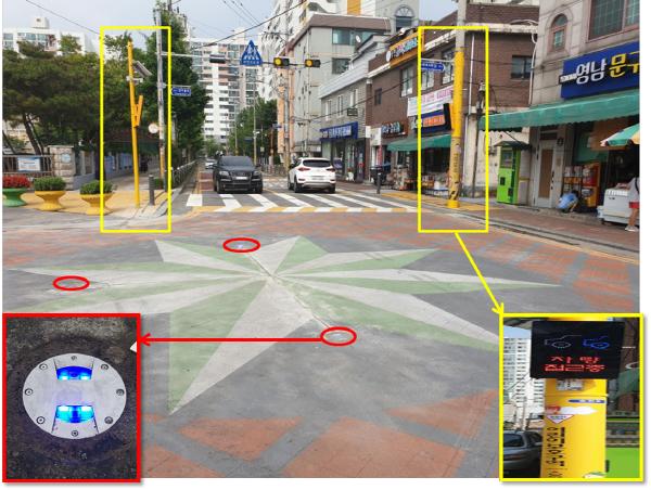 스마트 교차로 알리미는 신호등이 없는 교차로에 설치되는 교통시설물로, 차량 진출입시 보행자에게는 LED사인을 이용한 시각적 메시지와 경고 안내 음성으로 차량이 접근하고 있음을 알려주고, 운전자에게는 바닥 경광등으로 사람이 있으니 주의하라는 신호를 보내주는 시스템이다.