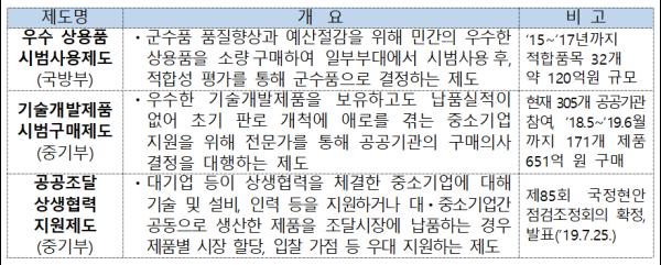 중기부는 국방부의 ‘우수 상용품 시범사용제도’를 통하여 군에서 시범사용 적합판정을 받은 품목을 성능인증 대상제품에 추가하여 수의계약이 가능하도록 지원할 계획이다.