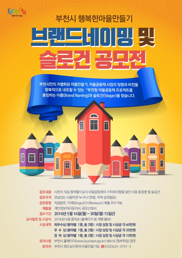 시는 부천형 마을공동체 회복운동을 주요 정책사업으로 확산하고 시민들이 함께 참여해 차별화된 마을공동체 사업의 방향과 비전을 함축적으로 내포할 수 있도록 하기 위해 ‘부천형 마을만들기 프로젝트’를 총칭하는 이름과 슬로건을 공모한다고 밝혔다.