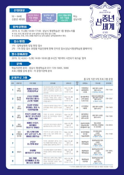 ‘신중년, 신세계로부터’를 주제로 한 12주 과정의 성남시민학교 강좌다. 자신의 재능을 어려운 이웃과 나누고자 하는 50~64세 성남시민 200명이 참여할 수 있다.