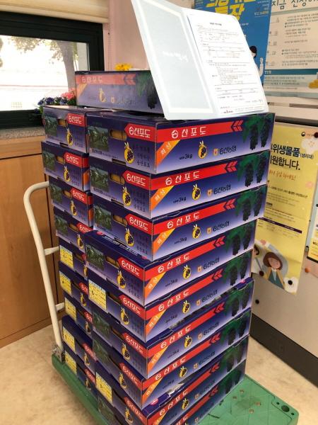 지난 6일 오전 화물운송업자 손병현 씨가 주위의 어려운 이웃에 전달해 달라며 포도 3kg 19박스를 군자동 행정복지센터로 기탁했다.