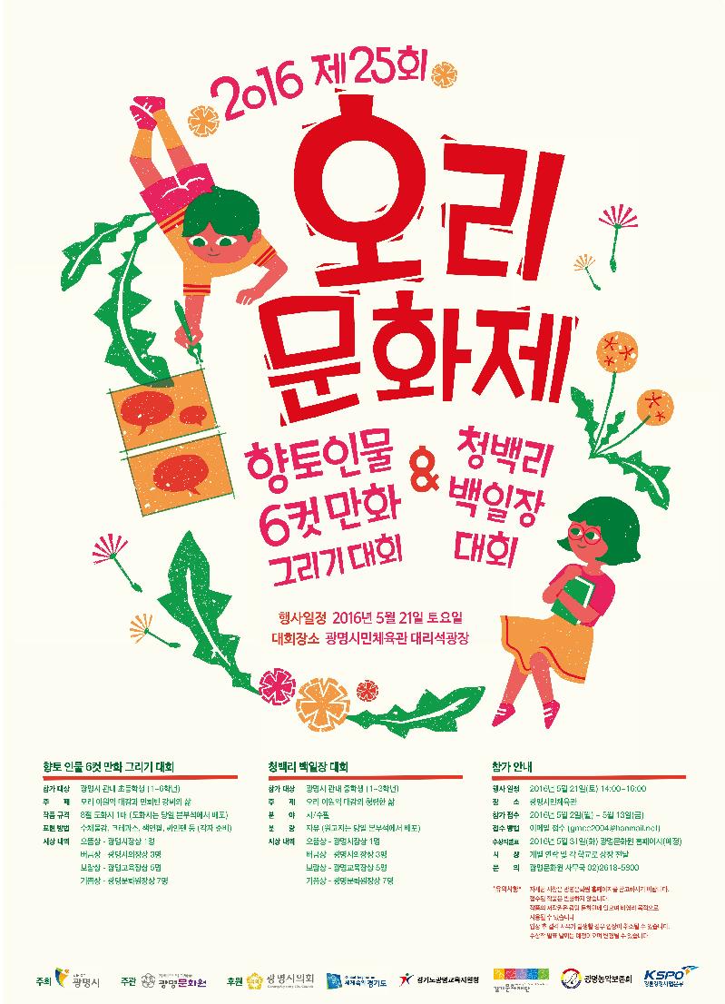[미디어타임즈=신정식 기자] 광명시는 오리문화제 기간 중 마지막 날인 21일 광명시민체육관에서 열리는 ‘제25회 오리문화제 청백리 백일장 & 향토인물 6컷 만화그리기’ 참가자를 모집한다고 밝혔다.