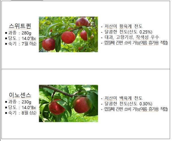 농촌진흥청은 기존의 천도 품종과 달리 신맛이 적고 단맛이 풍부한 천도 새 품종 ‘스위트퀸’과 ‘이노센스’ 묘목을 농가에 처음으로 보급한다.