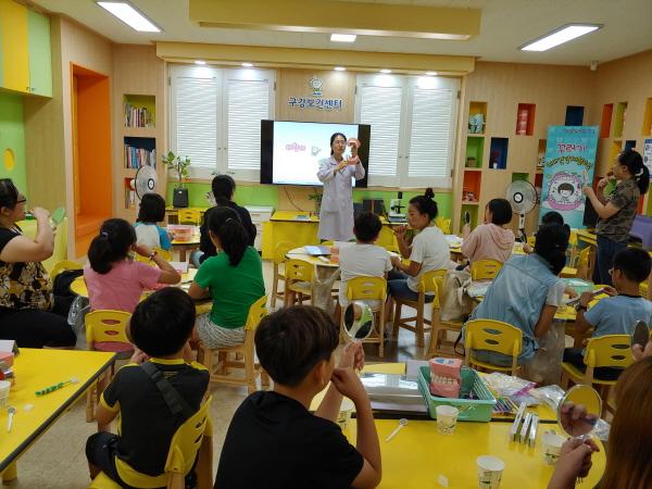 풍양보건소에 따르면, 8일 열린 ‘튼튼치아, 부모자녀교실’구강건강 체험프로그램에서는 현미경으로 직접 내 입속세균 관찰하기, 치아에 착색제를 발라 칫솔질이 잘 안된 부위 거울로 확인하기, 올바른 잇솔질법 교육, 불소달걀실험 가족구강보건서약서 작성하기 등의 활동을 진행됐다.