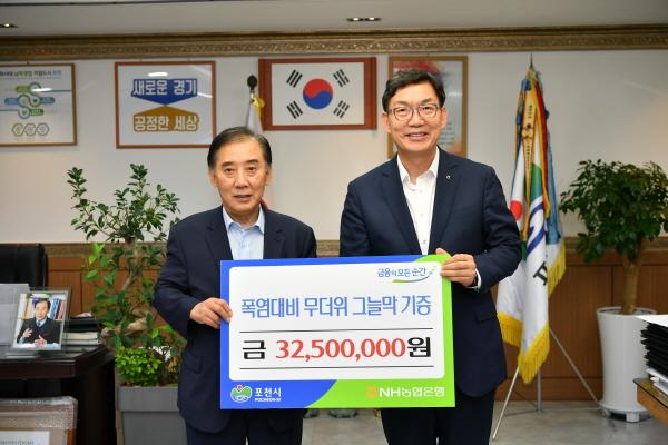 NH농협 포천시지부는 32,500천원 상당의 고정형 그늘막 13개를 전달하며, 시민들에게 편익을 제공하고자 포천시의 그늘막 설치 사업에 동참하게 됐다고 전했다. 현재 포천시는 유동인구가 많고 그늘이 없는 횡단보도를 중심으로 그늘막을 설치하고 있다.