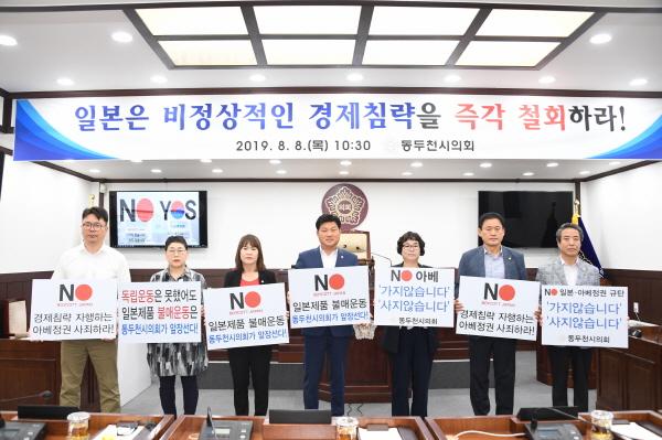 또한, 이번 조치는 대한민국 대법원의 강제징용 판결에 대한 명백한 무역보복으로, ‘강제노동 금지’와 ‘3권 분립에 기초한 민주주의’라는 인류 보편적 가치와 국제법 대원칙을 위반하는 것이며, 그들 스스로 강조하는 세계 자유무역질서를 해치는 행위라며, 이에 동두천시의회 의원 일동은 “한일 양국 간 경제 협력관계를 깨뜨리고 세계 경제를 위협하는 경제보복 조치를 즉각 철회하고, 일본 정부는 일제강제징용 피해자들에게 정당한 배상금을 지급하고 사죄”를 요구하면서, “일본의 태도에 변화가 없는 한, 전 국민적으로 열기가 확산되고 있는 일본 여행 자제 및 일본 상품 불매 운동을 적극 지지하고, 이에 동참한다.”라고 다짐하며, 동두천시 시민들이 적극적으로 참여하기를 호소했다.