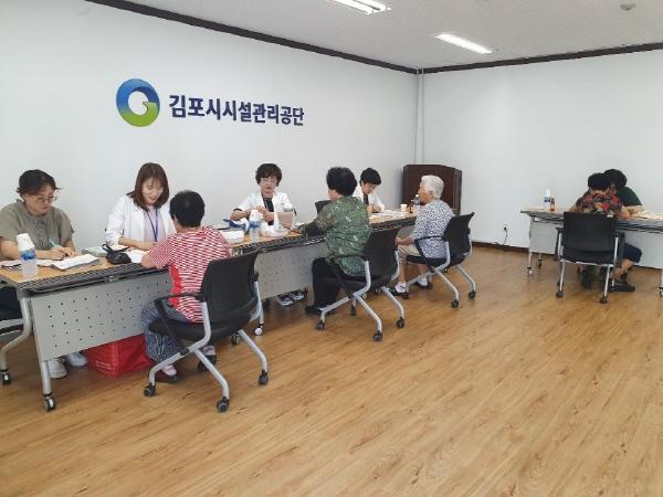 김포시시설관리공단은 연일 폭염이 지속되고 있는 가운데 본사 무더위쉼터 이용객을 대상으로 지난 6일 찾아가는 건강검진서비스를 실시했다.