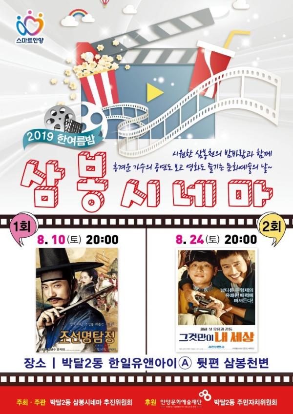 박달2동이 마련한 이른바‘2019 한여름밤 삼봉시네마’가 주말인 오는 10과 24일 두차례 오후 8시 삼봉천변 뒤편)에서 열린다고 안양시가 밝혔다.