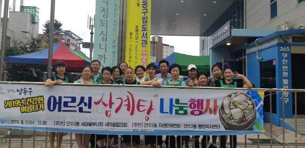 인천 남동구 만수2동은 지난 7일, 1주년을 맞이하는 새마을부녀회와 함께 새마을협의회 주관으로 지역 내 어르신 400여명을 모시고 ‘건강한 여름나기 어르신 삼계탕 나눔행사’를 가졌다.