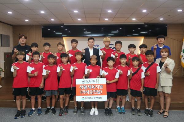 인천 동구체육회는 8일, 구청 대회의실에서 2019 화랑대기 전국 유소년 축구대회에 출전하는 동구유소년축구단에게 격려금을 전달했다.