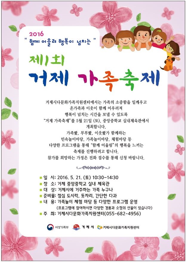 [미디어타임즈 = 최귀복 기자] 거제시다문화가족지원센터에서는 오는 5월 21일(토) 10시 30분~14시 30분 거제중앙중학교 실내체육관에서 2016 “함께 어울려 행복이 넘치는” 제1회 거제 가족축제를 실시할 예정이다.