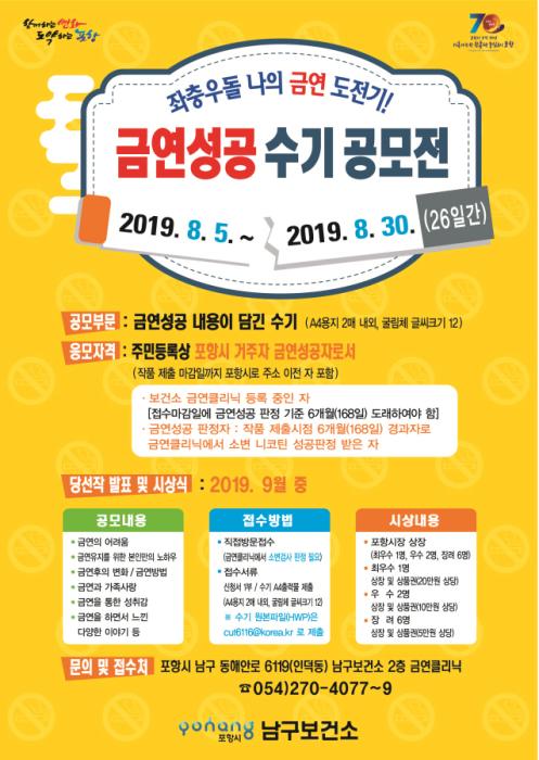 포항시 남구보건소는 오는 30일까지 금연클리닉 등록자 중 6개월 금연에 성공한 사람들을 대상으로 금연성공 수기를 공모한다..
