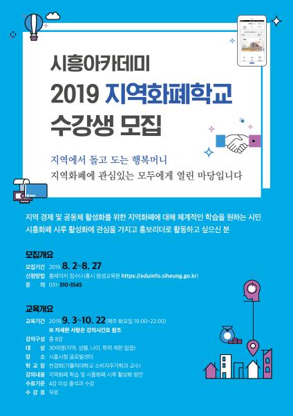 수강신청은 시흥시 평생교육원 홈페이지에서 할 수 있으며 신청자격은 지역, 성별, 나이 등의 제한 없이 지역화폐에 관심 있는 모든 시민들에게 열려있다. 수강료는 무료이며 4강 이상 수강자에게 수료증이 전달된다. 문의사항은 시흥시청 소상공인과로 하면 된다.