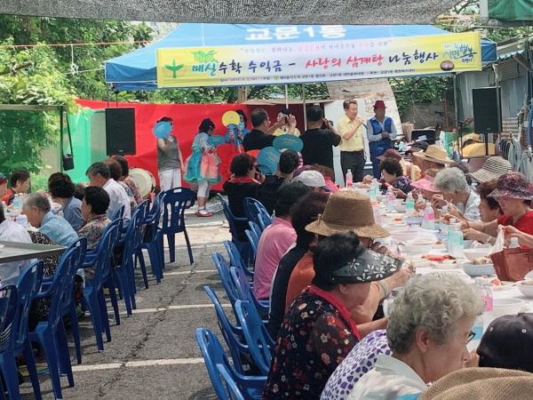 이날 행사는 새마을지도자 교문1동 협의회와 교문1동 새마을부녀회에서 주관하여 진행됐다. 참가한 새마을 회원들은 직접 닭을 손질하고, 끓인 삼계탕과 직접 다듬고 절여 만든 김치, 깍두기, 과일, 떡 등 푸짐한 먹거리를 준비하여 관내 독거노인들에게 대접했다.