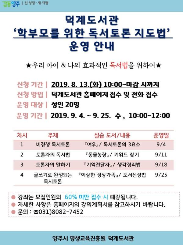 양주시 덕계도서관은 오는 9월 4일부터 25일까지 매주 수요일 ‘학부모를 위한 독서토론 지도법’ 강좌를 운영한다.