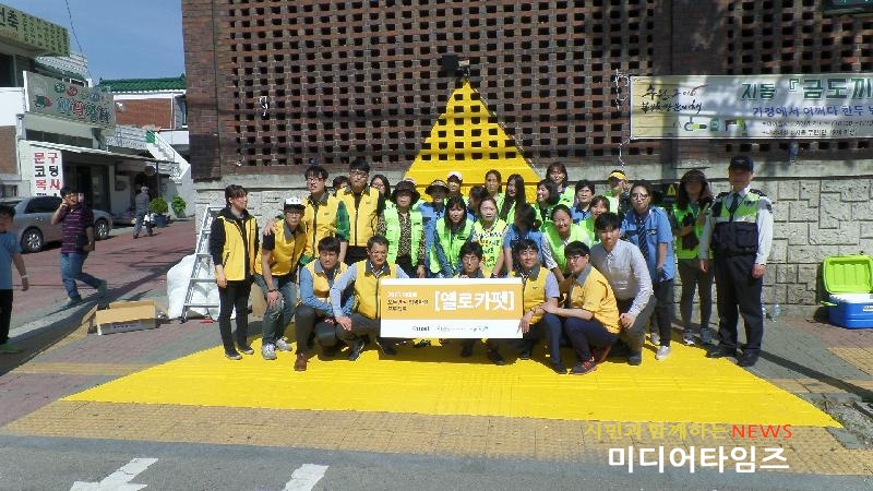 | 초등학교 횡단보도에 옐로카펫 설치후 기념사진을 찍고 있다. |