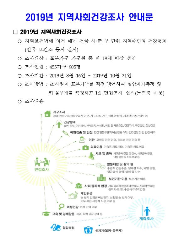 2019년 조사에서는 흡연, 음주, 식생활 등의 건강형태, 삶의 질 등 설문문항 면접조사와 신체계측을 하고, 올해는 혈압측정 조사를 정식으로 도입하여 지역별 고혈압 유병률 등 혈압 관련 지표들을 산출한다.