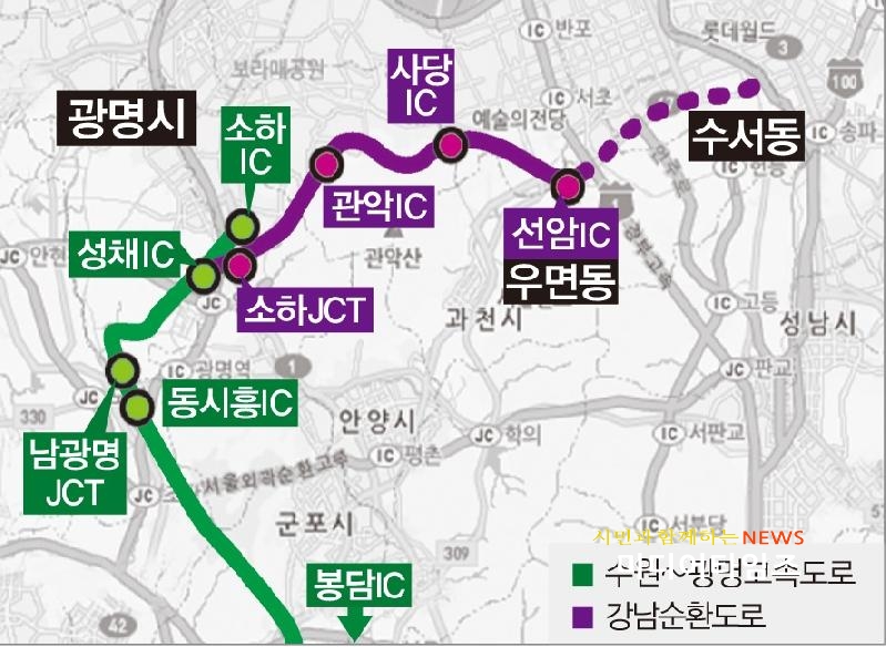 [미디어타임즈=신정식 기자] 강남순환도로 전체 구간 중 광명시 소하동(기아자동차 앞)에서 서울 서초구 우면동 간 12km구간이 7월 3일 우선 개통된다.