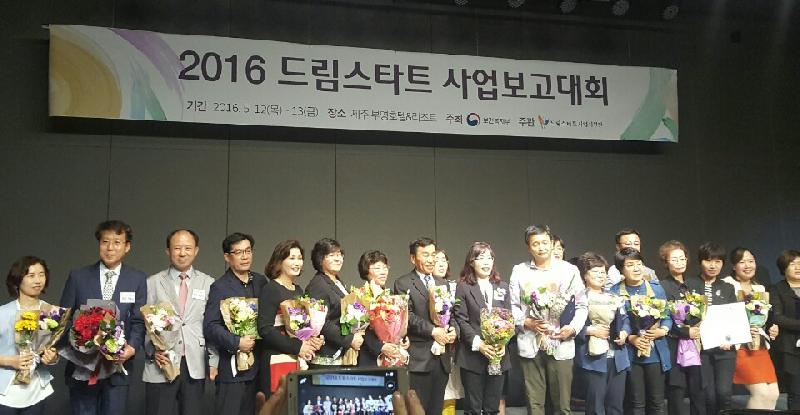| 드림스타트 2016 사업보고대회에서 우수기관 표창 수상 장면(사진=거제시청 제공) |