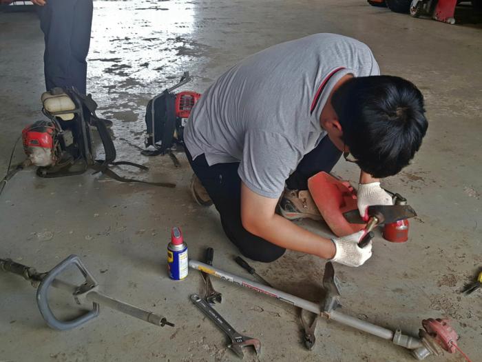 포항시 농기계임대사업소에서 예초기 날을 교체하고 있다. <미디어 타임즈>