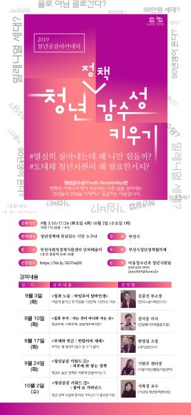 부천시 청년정책거버넌스인 청년정책협의체가 주관하는 이번 아카데미에서는 청년감수성을 ‘변화된 사회구조에서 부모 세대와 다른 삶을 살아가는 청년들의 현실을 이해하고 공감하는 마음’으로 정의하고, ‘정책은 공감에서 출발한다’를 슬로건으로 하여 ‘일과 노동, 집과 주거, 부채와 빈곤, 활동지원, 거버넌스’ 총 5강에 걸쳐 청년정책 강좌를 진행한다.