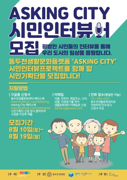 동두천시는 “동두천생활문화플랫폼 애스킹 시티” 사업을 추진하면서 시민인터뷰 프로젝트를 함께 할 인터뷰어를 모집한다.