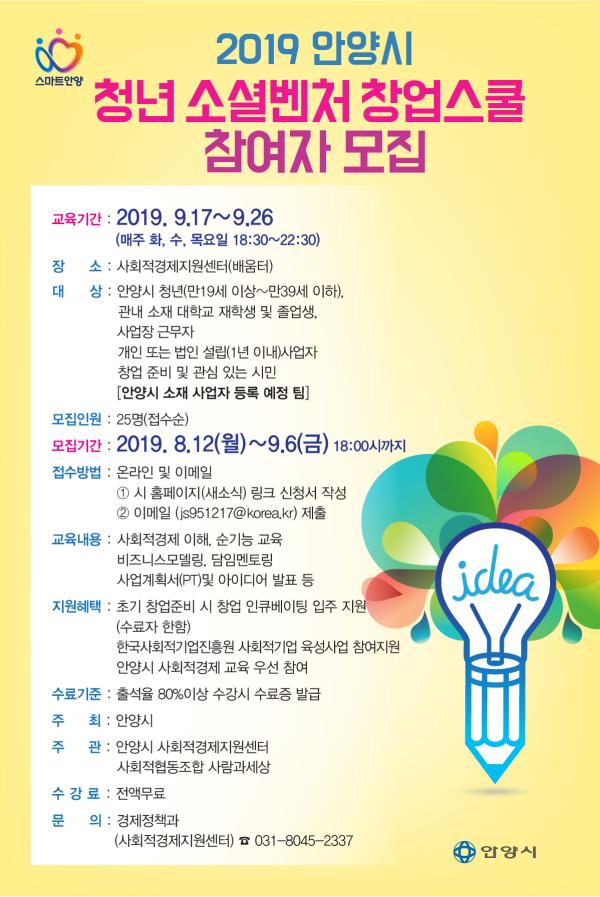 특히 우수 아이템을 제안한 교육생에 대해서는 청년 소셜벤처 육성사업 공모전에 참가할 수 있도록 지원한다. 기타 궁금한 사항은 안양시 사회적경제 지원센터로 문의하면 된다.