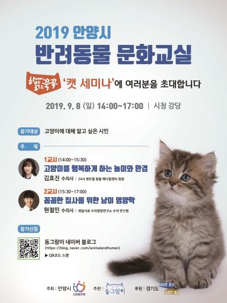 안양시가 반려동물 문화교실‘캣 세미나’를 다음달 8일 시청대강당에서 개최한다고 밝혔다.
