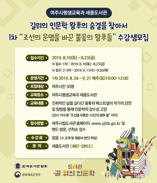 세종도서관 길 위의 인문학“왕후의 숨결을 찾아서”는 중학생 이상 여주시민이면 누구나 무료로 신청 가능하다. 여주시립도서관 홈페이지를 통해 접수가 가능하며 문의사항은 평생교육과 세종도서관팀로 전화하면 된다.