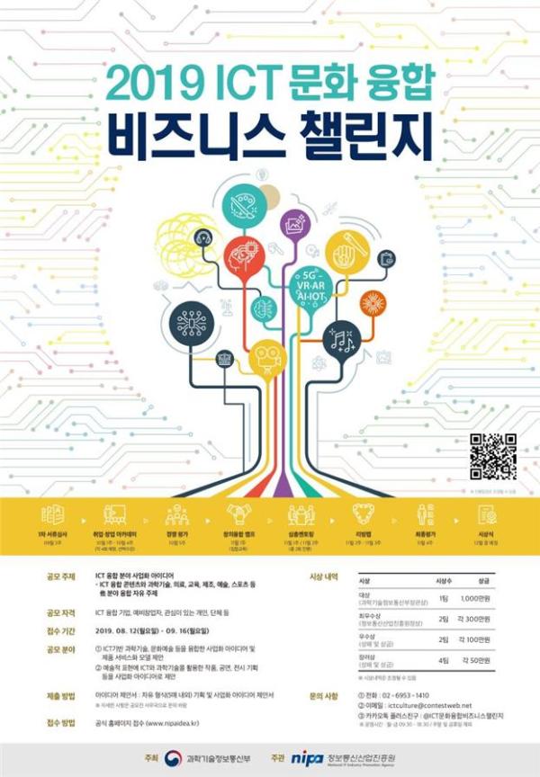 과학기술정보통신부가 주최하고 정보통신산업진흥원이 주관하는 ‘2019 ICT-문화융합 비즈니스 챌린지’ 공모전 접수를 12일부터 오는 9월 16일까지 진행한다.