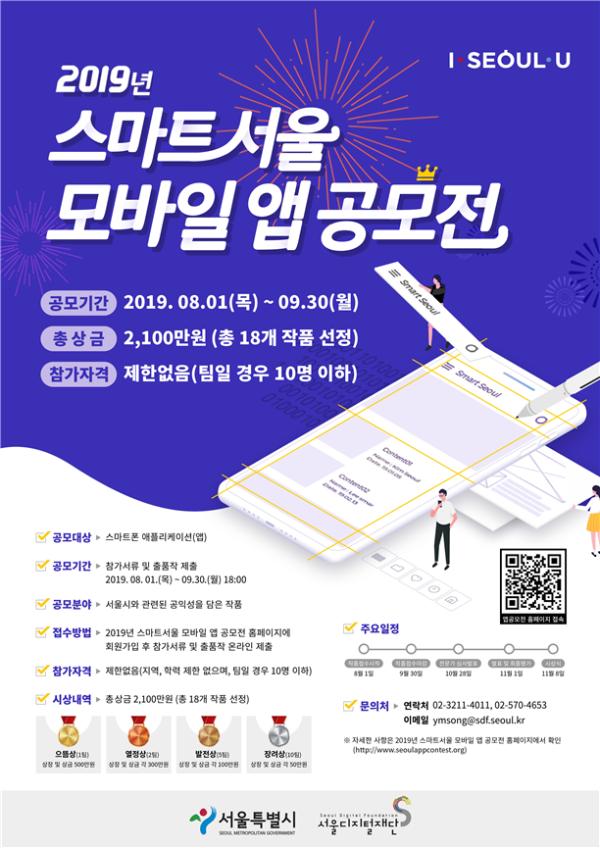 서울디지털재단은 서울시민에게 유용한 애플리케이션을 서비스하기 위해 총 상금 2,100만원을 걸고‘2019년 스마트서울 모바일 앱 공모전’을 개최한다고 밝혔다.