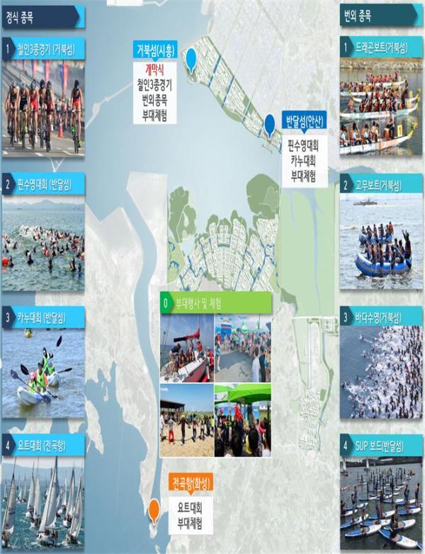 이번 제전에서는 요트, 카누, 철인3종, 핀수영 등 4종의 공식경기와 드래곤보트, 고무보트, 바다수영, SUP보드 등 4종의 번외경기가 열린다. 메달수는 금메달 380개, 은메달 384개, 동메달 388개 등 총 1,152개이며, 이를 놓고 5천여 명의 선수들이 기량을 펼치게 된다.