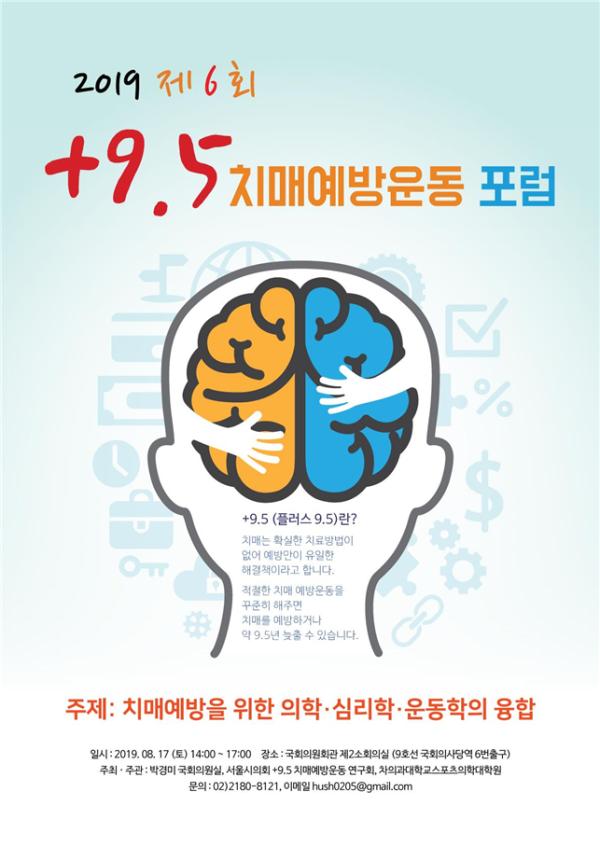 서울시의회 문병훈 의원이 대표를 맡고 있는 서울시의회‘+9.5 치매예방운동연구회’는 다가오는 8월 17일 토요일 오후 2시, 국회의원회관 제2소회의실에서 ‘2019 제6회 +9.5 치매예방운동포럼’ 을 개최 할 예정이다.