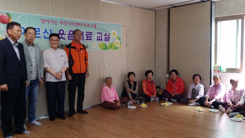 프로그램에 참여한 어르신들도 주민자치위원회가 준비한 떡, 음료를 드시면서 약1시간동안 진행된 웃음치료 교실에 매우 즐거워하고 거동이 불편한 어르신들을 찾아주어 너무 고맙다며 이러한 좋은 프로그램을 확대해 주었으면 한다고 소감을 밝혔다.