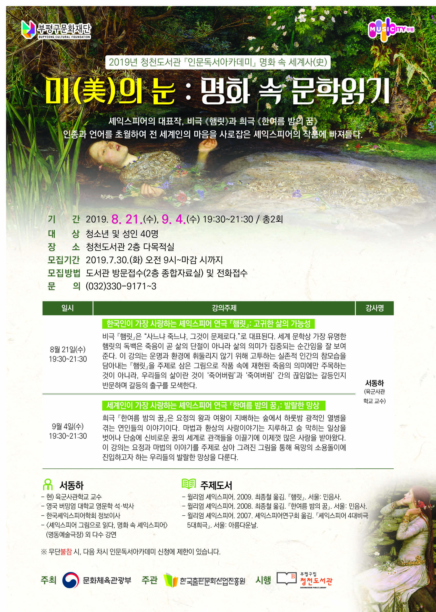 부평구 청천도서관은 오는 21일과 9월 4일 저녁 7시 30분에 ‘2019년 인문독서아카데미 제3차 프로그램 ? 미의 눈: 명화 속 문학읽기’를 운영한다.