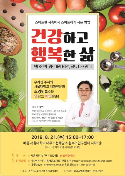 시흥시는 오는 21일 오후 3시 배곧 서울대학교 대우조선해양 시험수조연구센터에서 ‘당뇨명의’ 서울대병원 내분비내과 조영민 교수를 초청해 ‘건강하고 행복한 삶’을 주제로 강연을 개최한다.